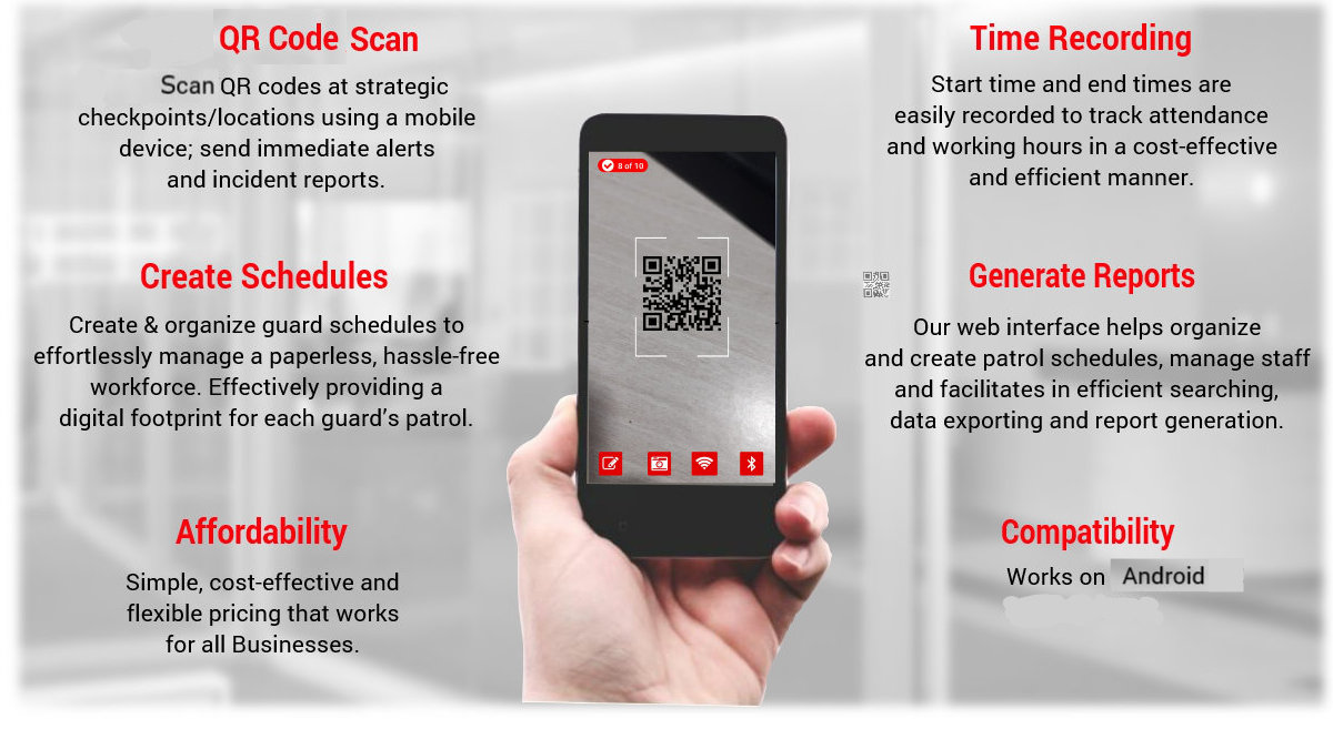 Scan QR Codes Tags at various checkpoints placed on buildings/premises and report immediate patrolling information and alerts related to each location.